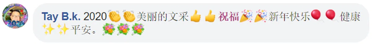 红蚂蚁本以为没戏了,结果昨天2020年元旦日点开面簿,何晶的新诗就蹦了出来,洋洋洒洒长长一首,祝大家2020年新年快乐。看来有丈夫李显龙休假在家陪伴,夫人创作灵感源源不断。
