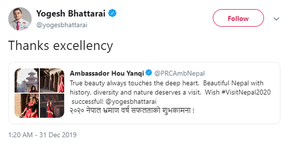 就在12月30日跨年之际,中国驻尼泊尔大使侯艳琪在推特上发了一组自己在尼泊尔加德满都的美照,为2020尼泊尔旅游年助攻!