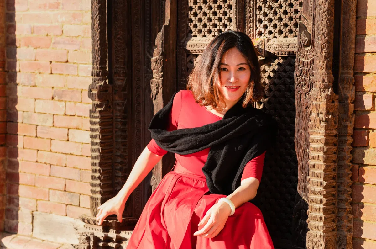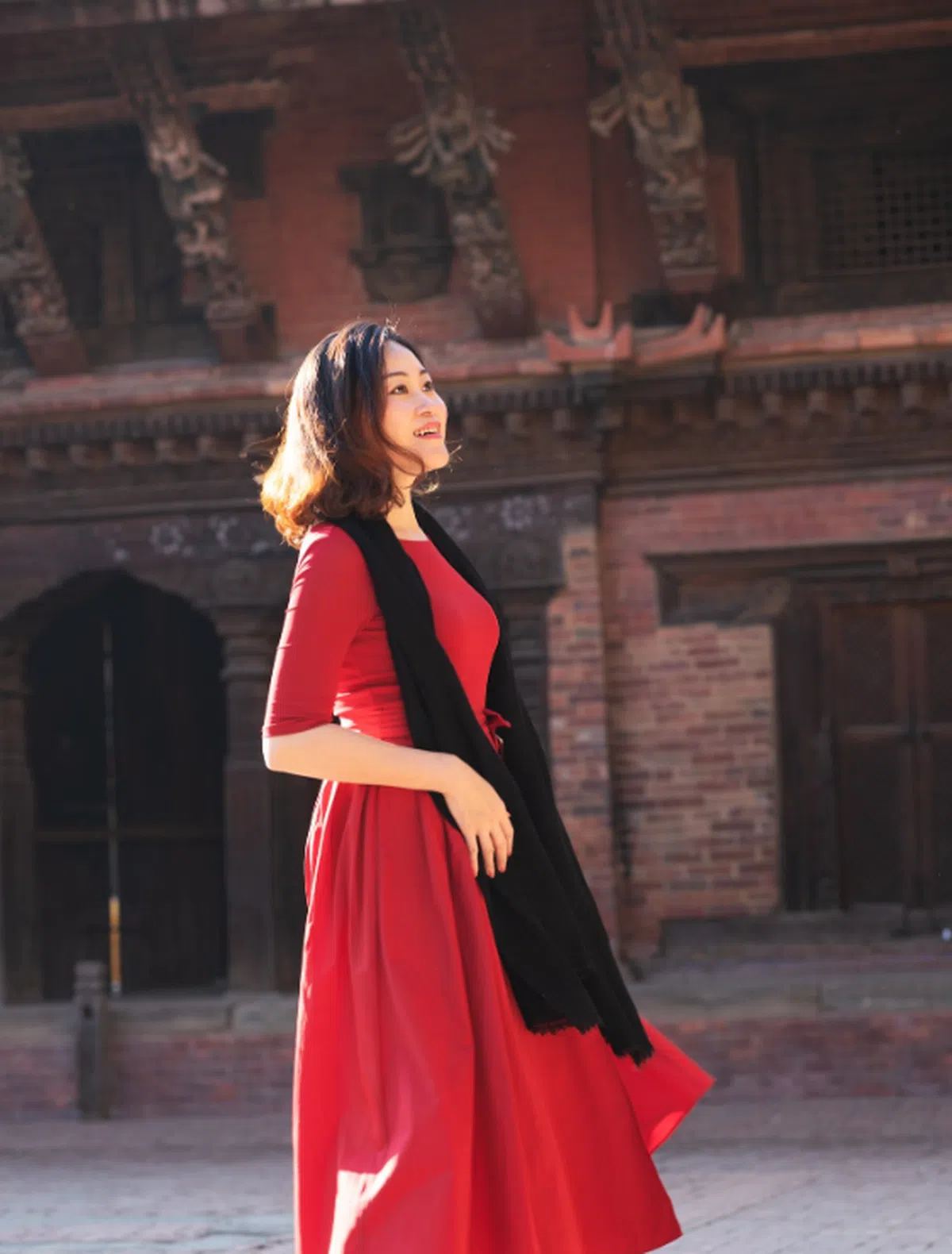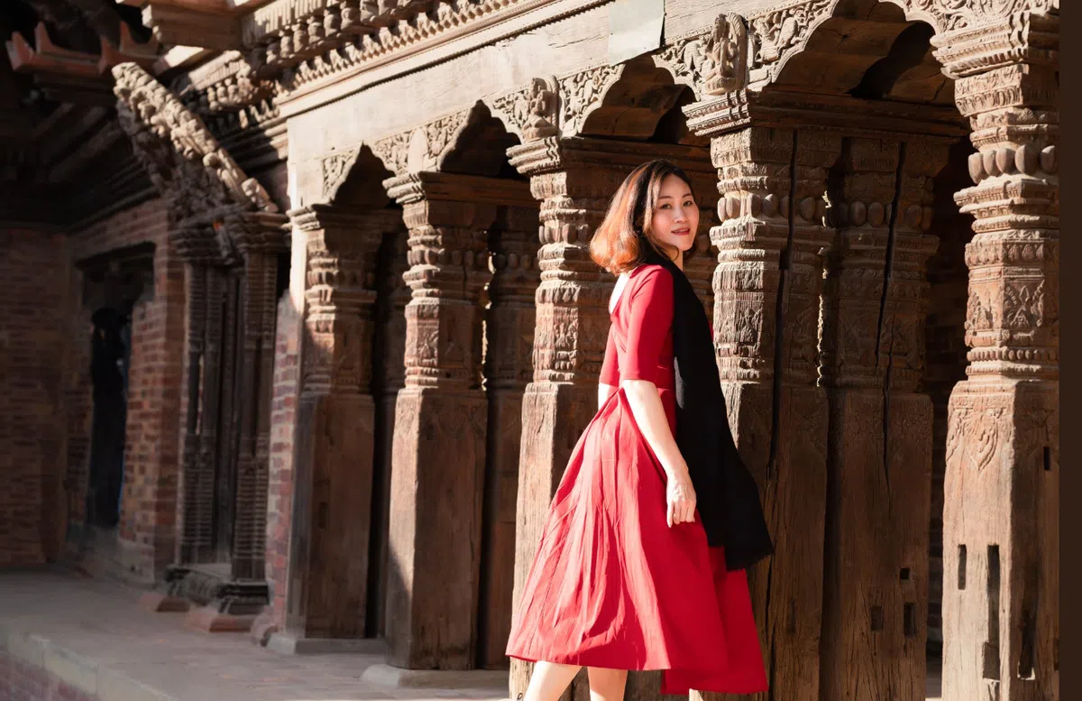 一袭红裙的她在浪漫之城加德满都留下的倩影不止尽显她的优雅美丽,也尽显了尼泊尔这个国家的神秘和美丽。