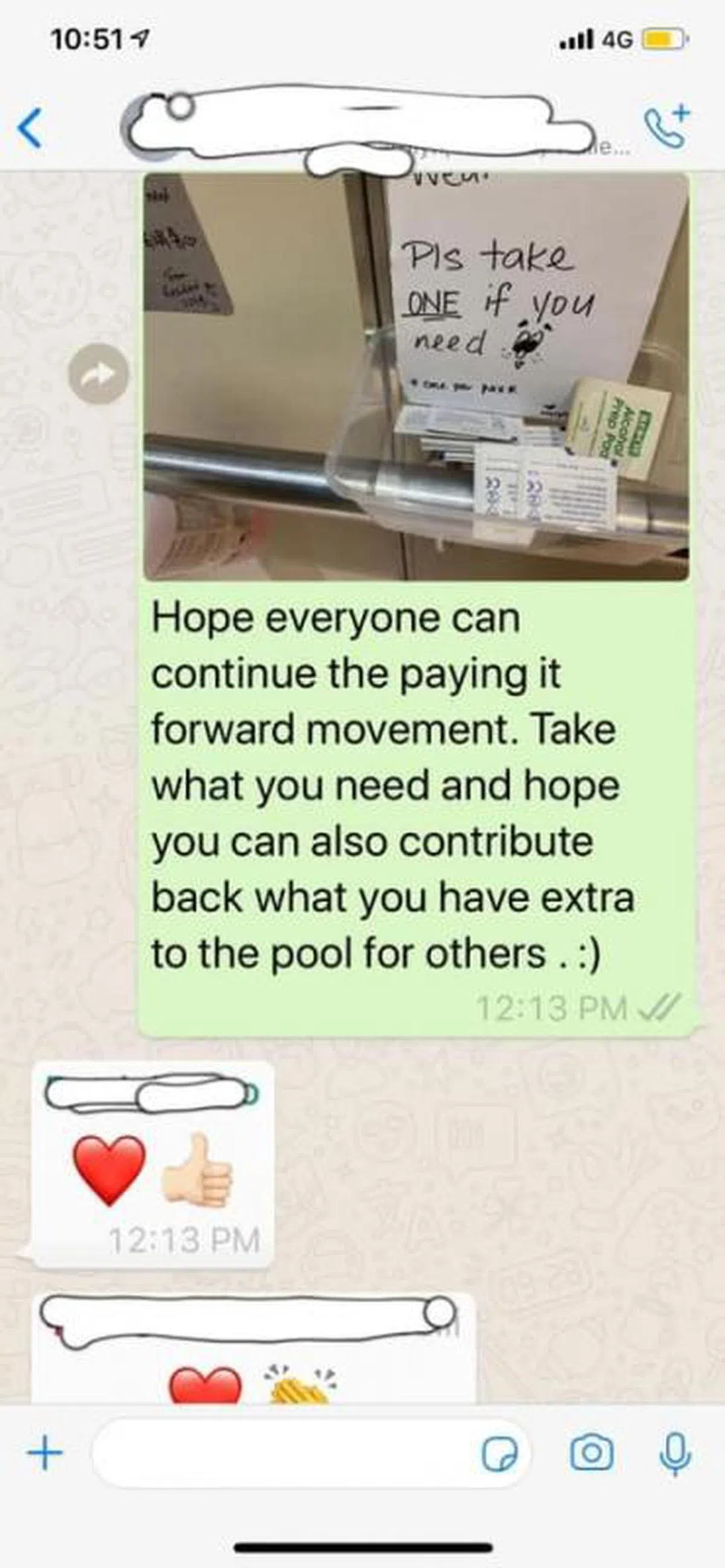 榜鹅居民也通过Whatsapp群组的方式呼吁大家将这个暖心举措延续下去,有人施与才会有人有所得。