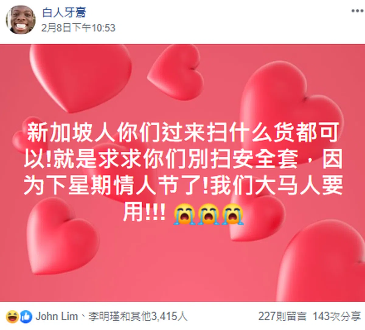 “新加坡人你们过来扫什么货都可以!就是求求你们别扫安全套,因为下星期情人节了!我们大马人要用!”