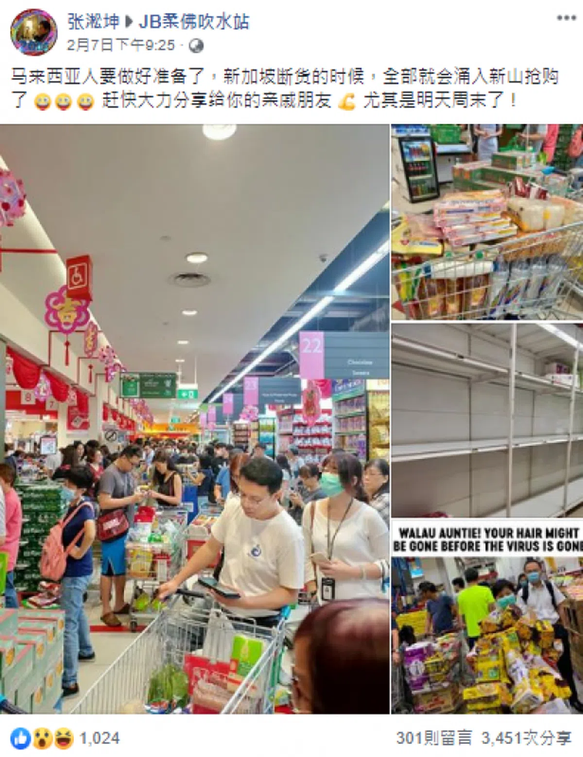 就连柔佛州行政议员潘伟斯也宣称新加坡人“可能会越堤到新山抢购”,不过他也加了一个“若新加坡货源出现短缺”的前提。