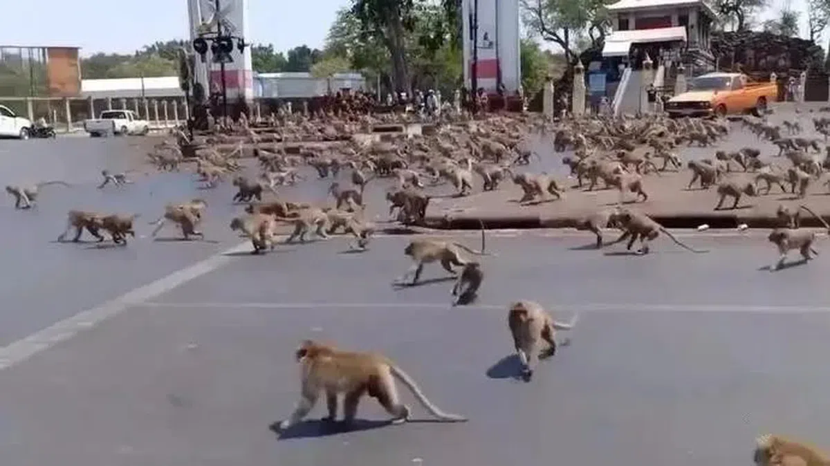 在一些旅游胜地,动物通常都会从游客身上获取食物,久而久之就成了一种依赖。在泰国卢普布理,一大群猴子因为没有游客的投喂而饥肠辘辘,在广场上展开了食物争夺战。