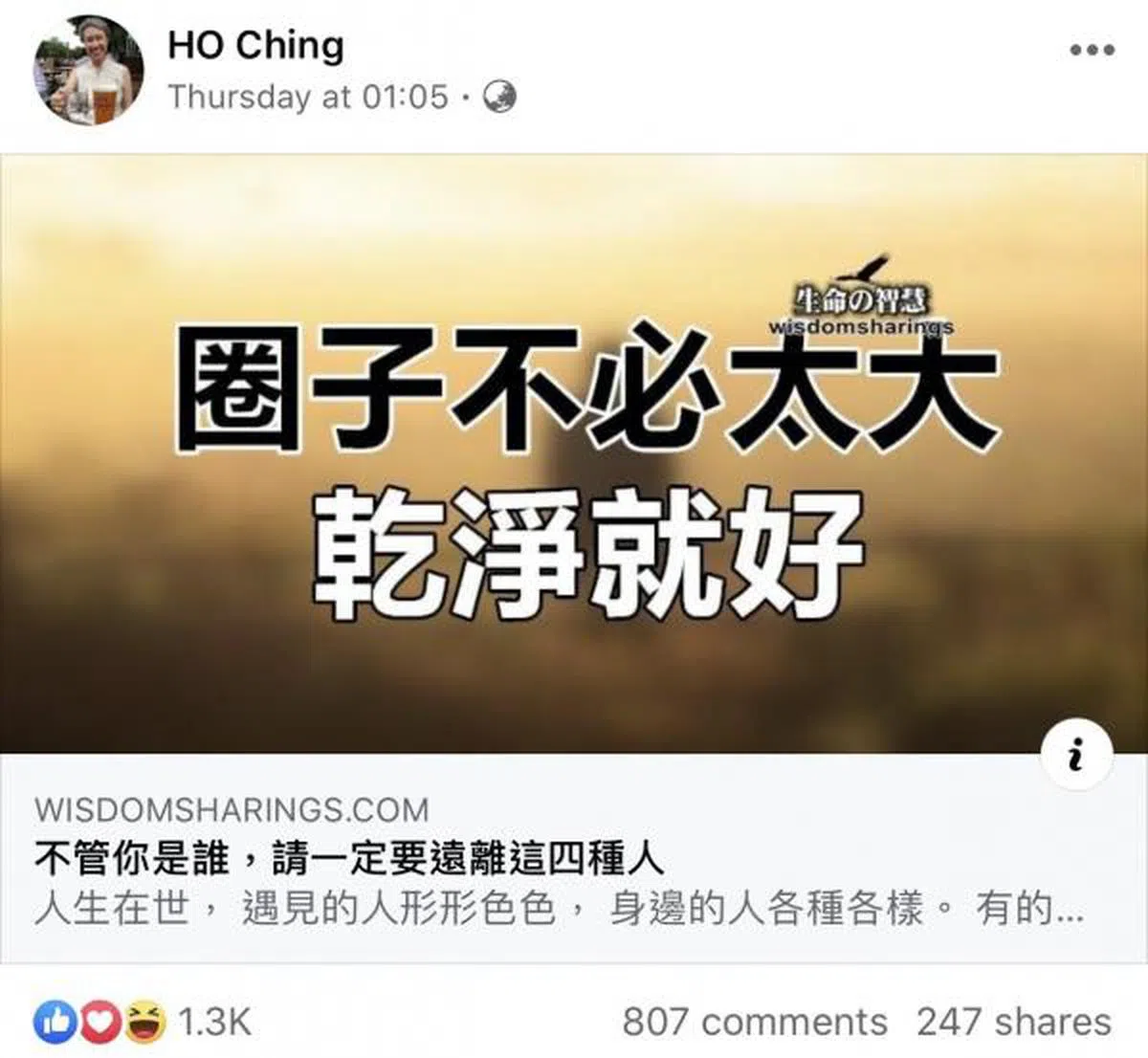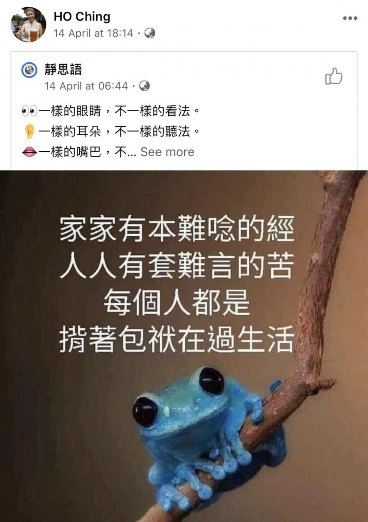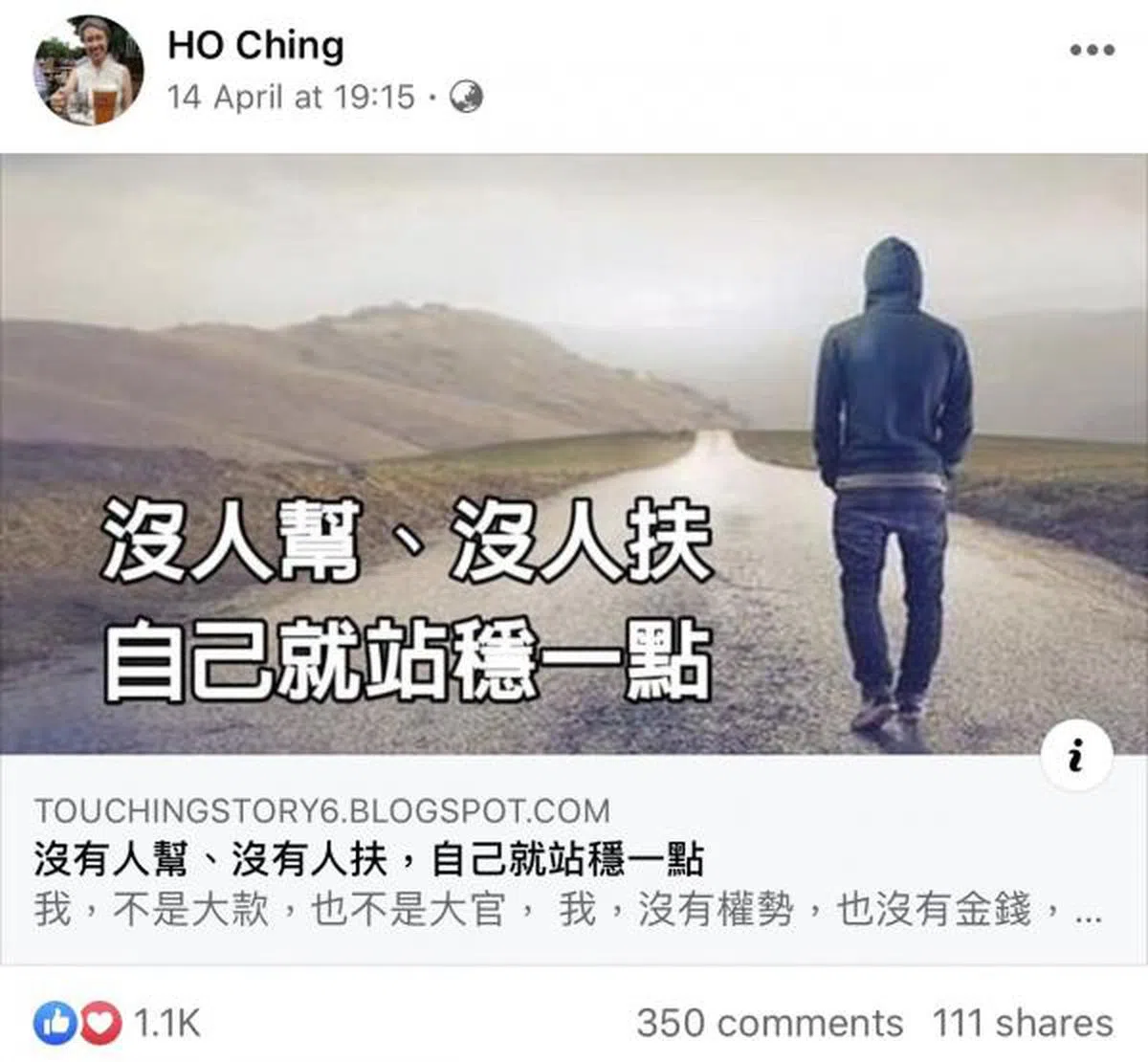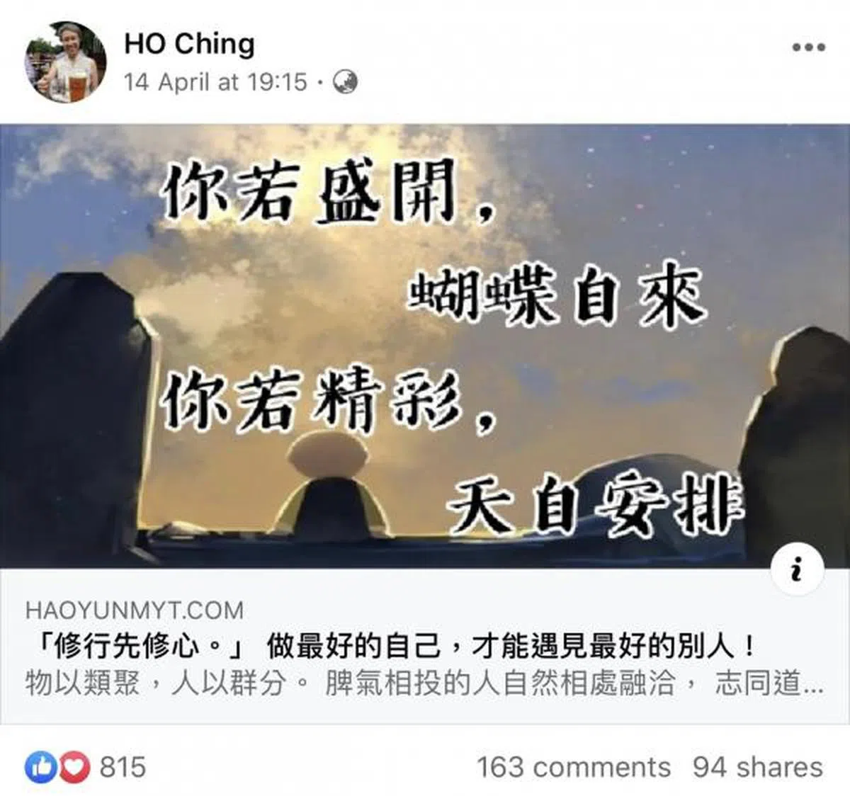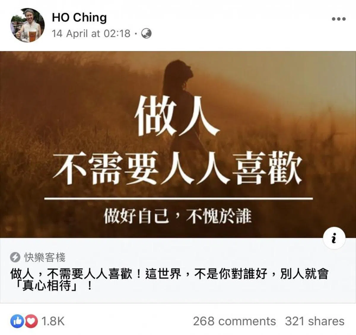 我生来就是特立独行的(maverick),因为我出生时跟别人不一样,是脚先出来的,所以血液里流淌着不恭敬(irreverence)……耶! 没事,人生就是如此,明天又是新的一天! 大家晚安、好好休息! 非常感谢大家,谢谢你们罩着我,尤其感谢那些在互相关照着彼此和关照新加坡和其他地方有需要的人的公众。 加油! 拥抱! ??????????????