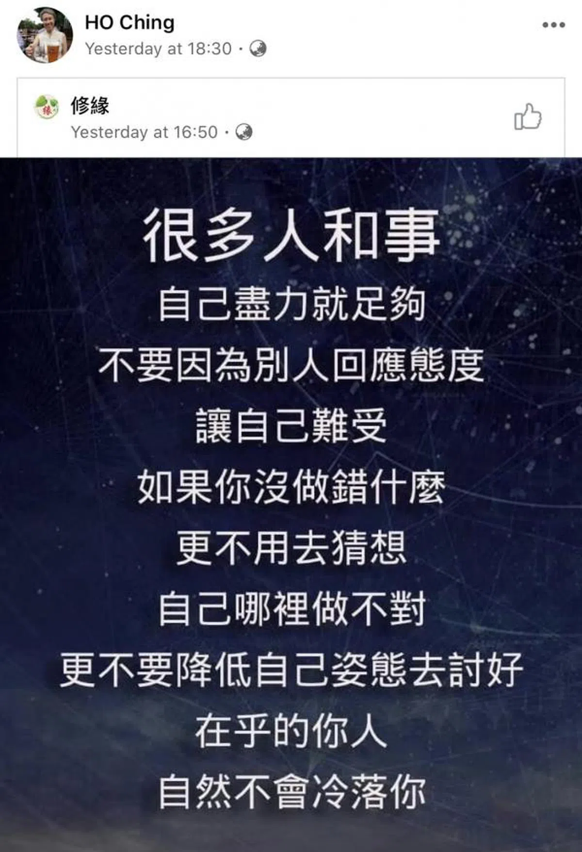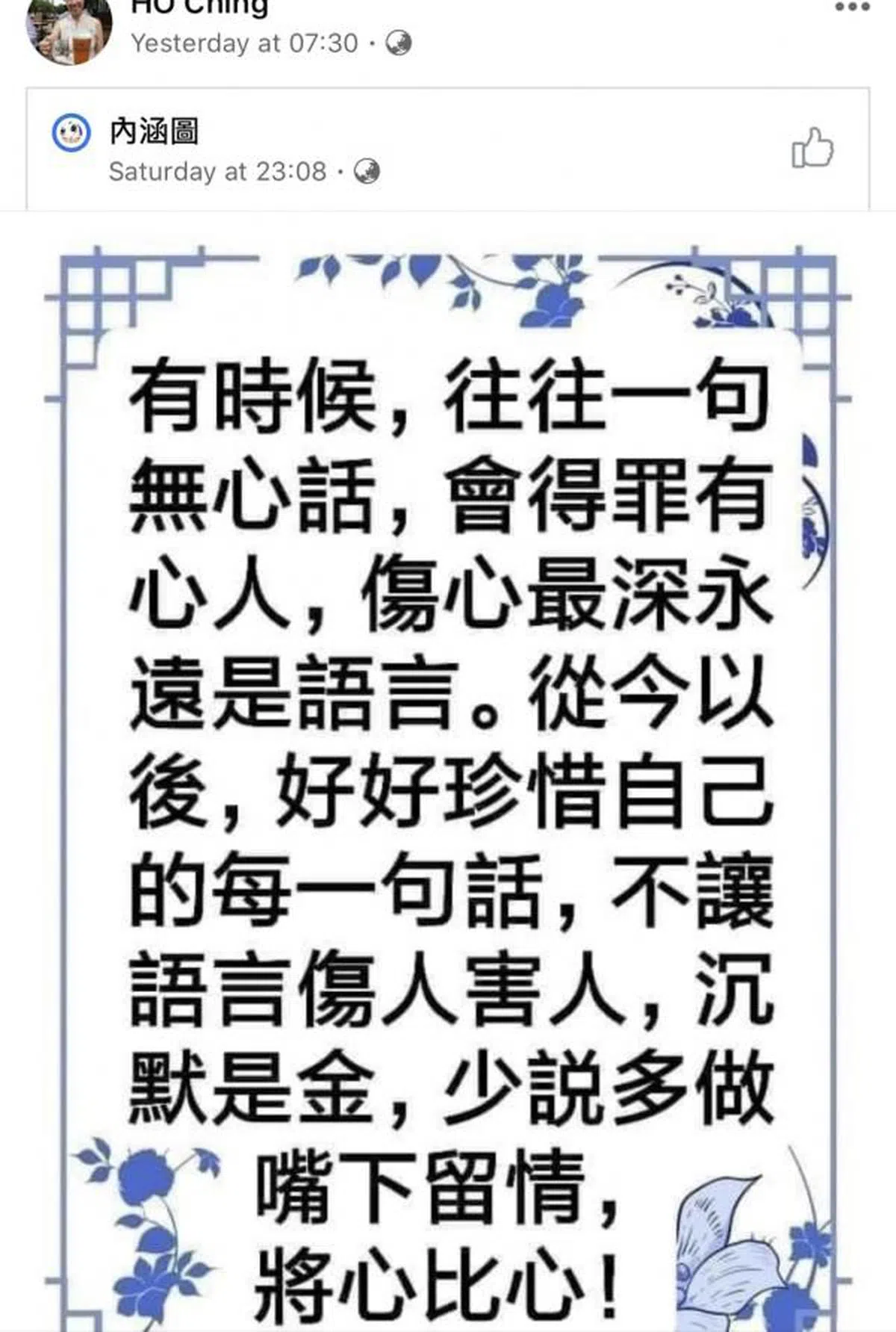 夫人倒是老神在在,既不生气,也没有在言辞上发出严厉警告或谴责。她还是按照一贯风格,用一则又一则看似老掉牙的警世箴言来“有感而发”,这些贴文都是用繁体字写的。