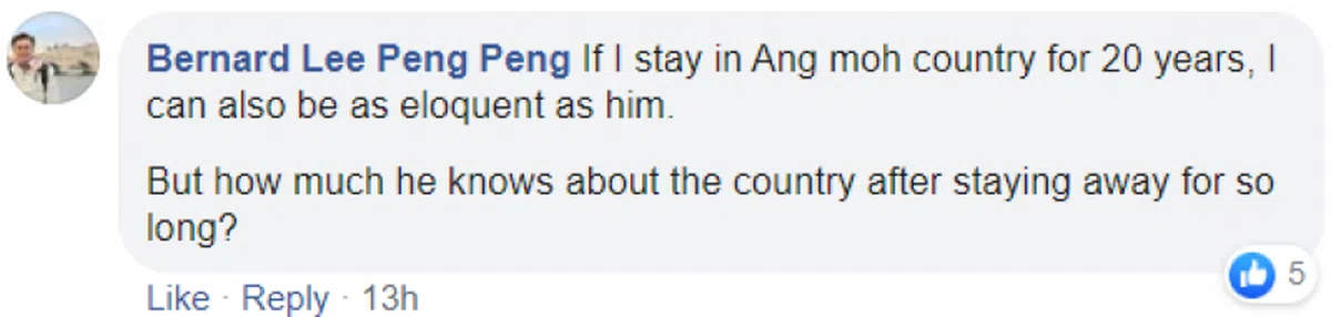 有网民对他那腔ang moh口音的英语很不习惯,带点酸溜溜地语气说道: