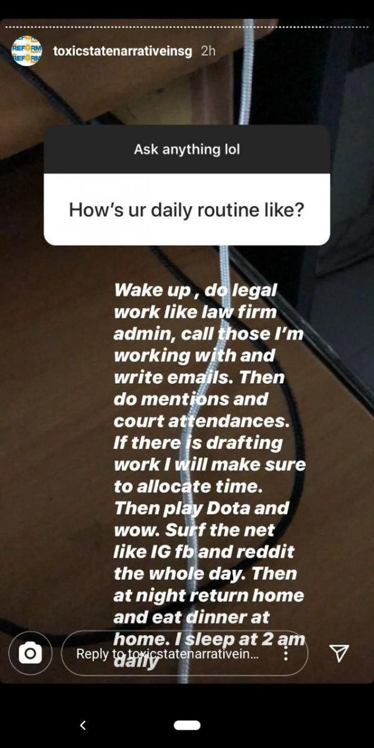 “起床、做法律相关的工作如律师楼行政管理、打电话给那些与我共事的人、发电邮。准备过堂单及出庭单。如需草拟文案就拨出时间。然后就打电玩Dota和WOW。接着上网查看面簿、Instagram和Reddit论坛。晚上回家吃饭。每天凌晨2点睡觉。”