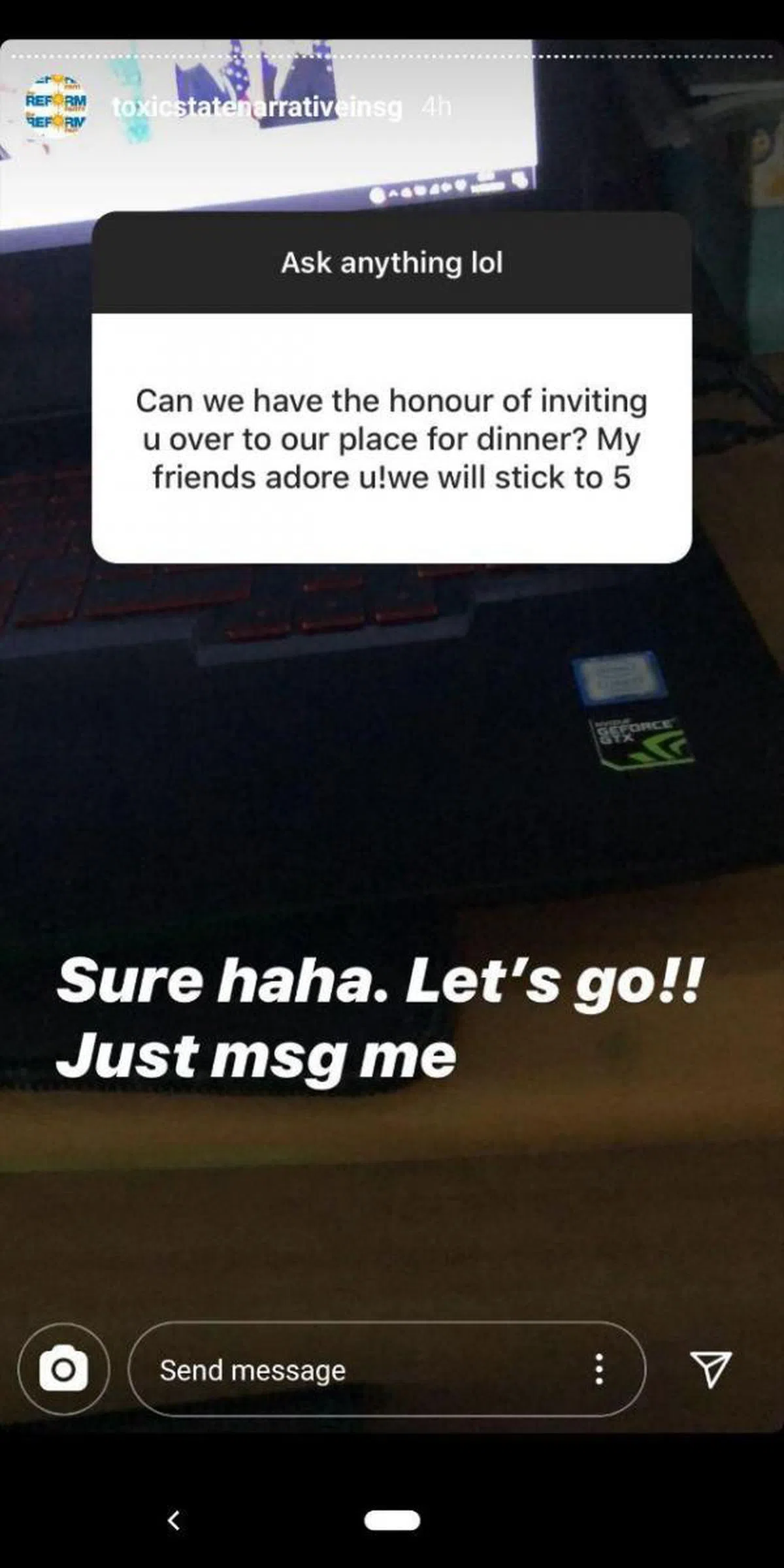 问:我们能邀请你上门吃饭吗?我朋友都很崇拜你。保证维持在五人。