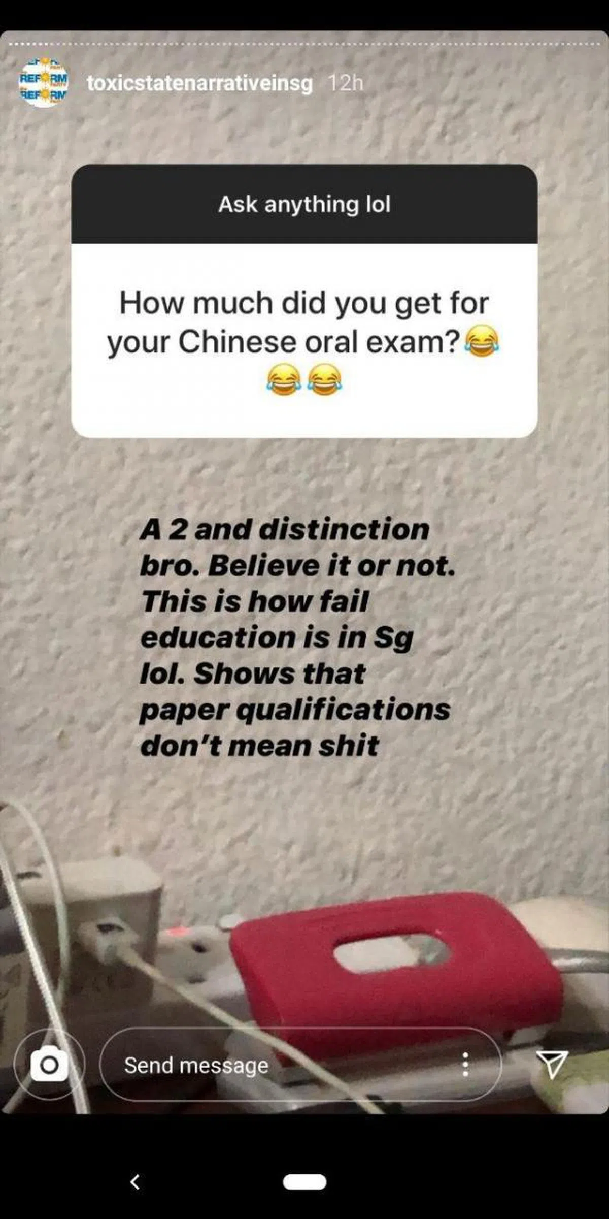 “老兄,我考到A2和特优。信不信由你。从这可看出新加坡教育的失败,放声大笑。这也证明了文凭根本是瞎扯。”