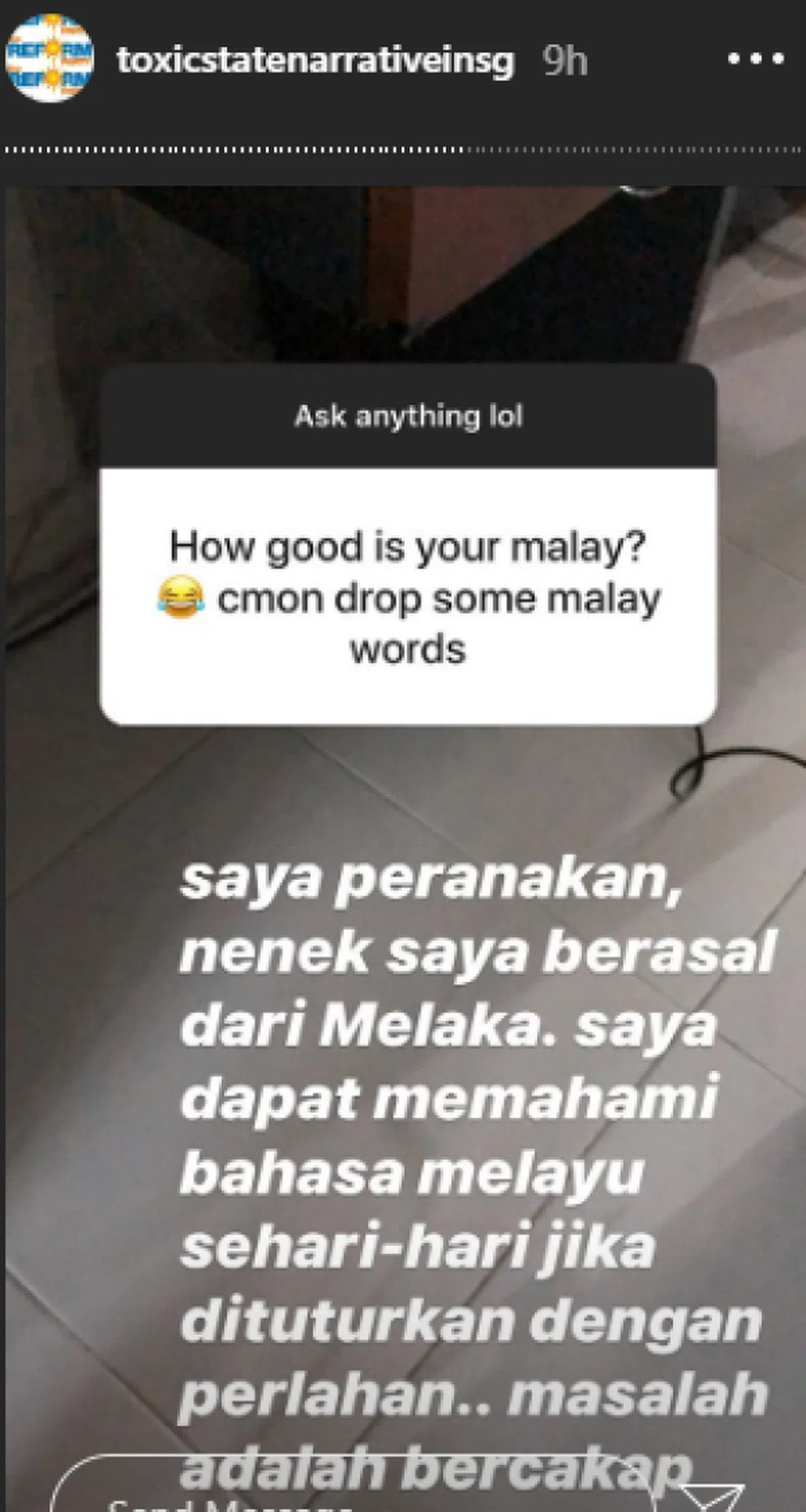 “我是一名土生华人。我祖母来自马六甲。日常的马来语说得慢一点我可以听得懂。要开口说就成问题。”