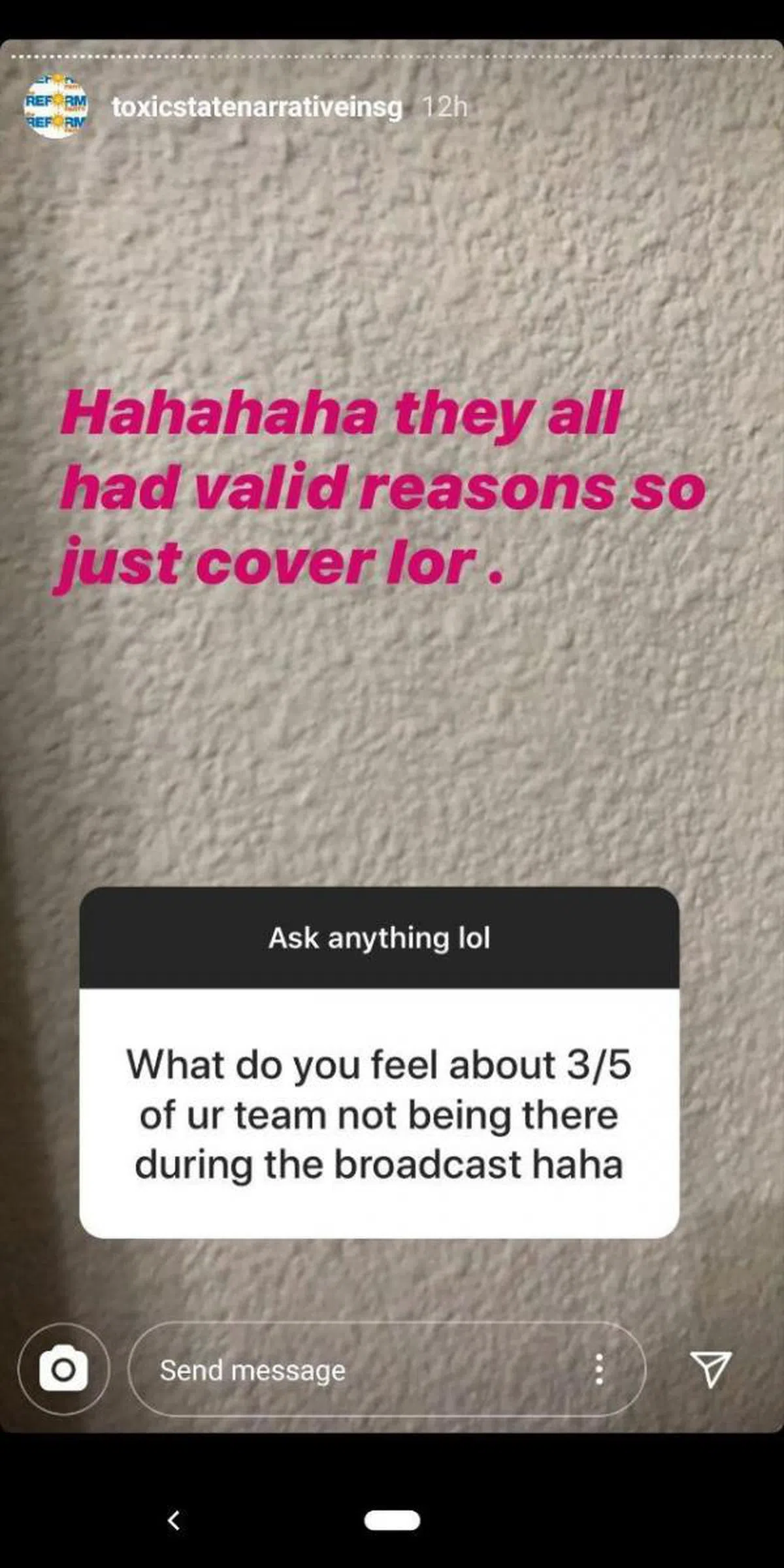 问:你的队友有3/5都无法出席竞选广播,哈哈,有何感想?