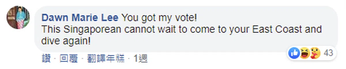 “我的一票投给你。我这位新加坡人已经等不及去你们的东海岸潜水了!”