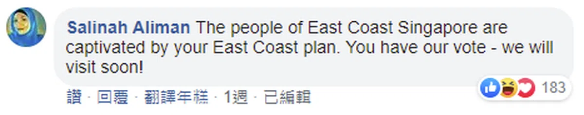 “来自新加坡东海岸的新加坡人深深为你们的东海岸计划着迷。你们赢得我们的一票了,我们不久后就会去那里旅游哦!”