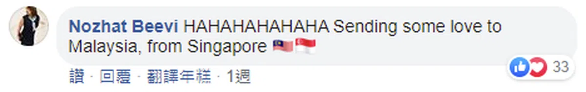 “哈哈哈哈,向马来西亚致意,我来自新加坡。”