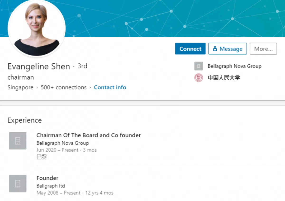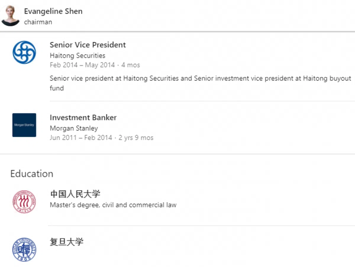 沈屮的领英个人网页写着,她毕业于中国两所顶尖学府:复旦大学和中国人民大学。在中国人民大学,她拿到了民事与商业法律的硕士文凭。