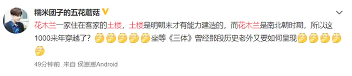 尤其是剧中那一盏盏出现在祠堂外的红灯笼、军营外的雕像,以及木兰居住的房屋及周围的环境都不符合当时的朝代背景,让观众不禁感慨这就像是一部穿越剧。