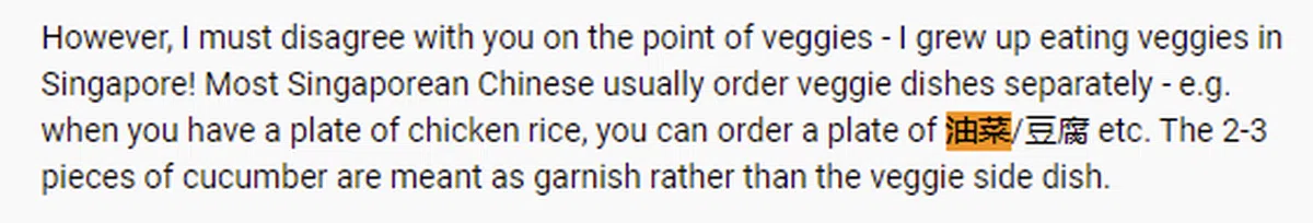 说起这道国宝级美食,有新加坡网民不忘提醒理察黄瓜只是装饰不是配菜,如果需要的话他可以加钱再点上一道油菜。