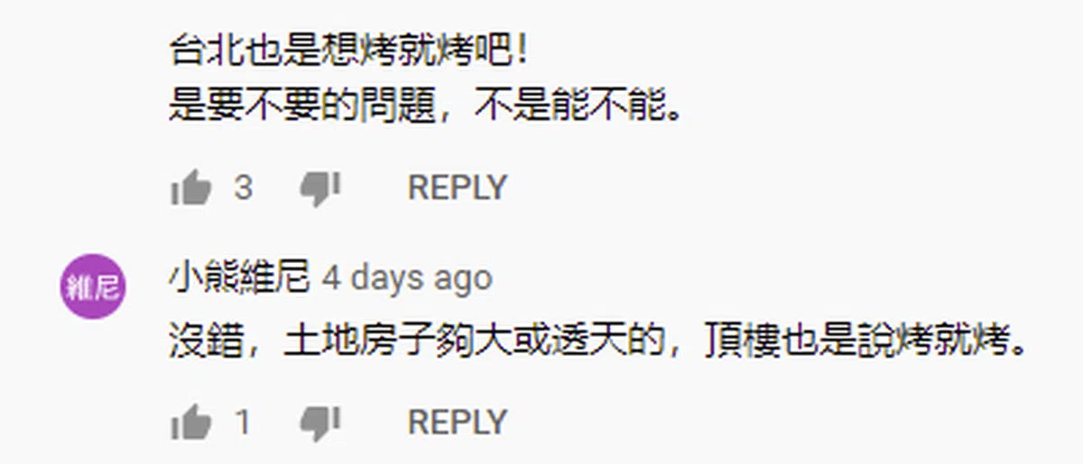 有网民则表示理解理察的顾虑,认为他需要的是专门拿来烤肉,且合法的地方(虽然实务上执法当局也是经常睁一只眼闭一只眼就是了)。