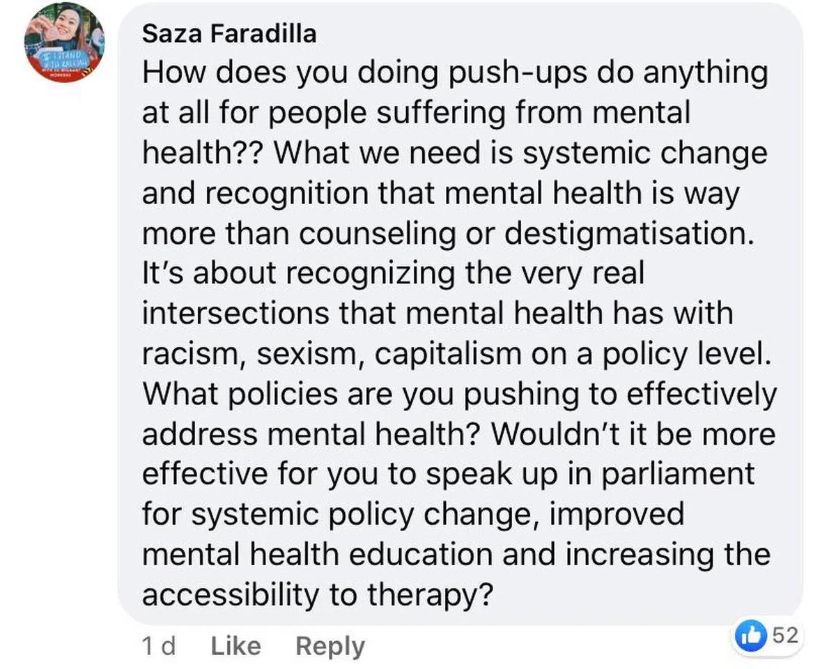 网友劈头就问,你做伏地挺身对备受心理健康问题折磨的人有什么帮助吗?我们需要的是系统的改变和认识到心理健康,不仅仅是咨询或去除标签,而是必须意识到政策层面上,心理健康与种族主义,性别歧视,资本主义有真实的交集。你正在推动哪些政策来有效解决心理健康问题?如果你能在国会里呼吁政府采取系统上的政策改变、改善心理健康教育、增加治疗的普及性,难道不是更有效吗?
