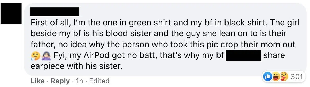“我就是身穿绿色衣服的女子,身穿黑色衣服的男子是我的男朋友。在我男朋友身旁的是他的亲姐妹,她边上的男子是他俩的父亲。不知道为什么,拍下照片的人不把两人的妈妈拍在里头。” “噢对了,我的苹果无线耳机AirPod没电了,所以我的男朋友和他姐妹共用一个耳机。”