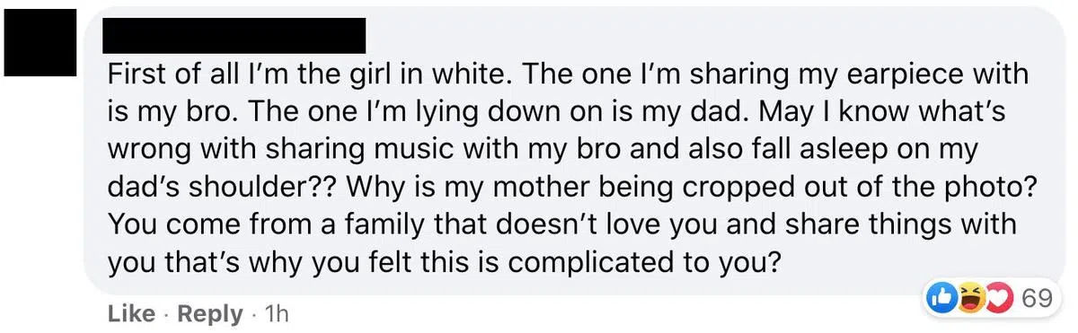 “我就是身穿白色衣服的女子,和我共用一个耳机的是我的亲兄弟,我头靠在我爸爸肩上。请问和兄弟一起听音乐,然后头靠在爸爸肩上睡觉,何错之有?还有,为什么照片中我的妈妈被裁掉了?” 最后,她也不忘酸一下偷拍这两张照片的网民说: “你是不是来自一个不爱你,而且不喜欢与你分享事物的家庭?所以你才会觉得事情很复杂?”