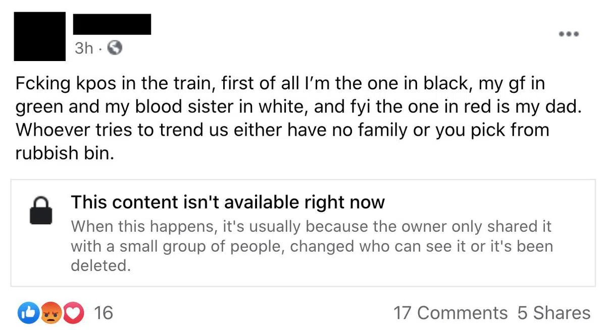 “我们发布的一张照片后来在社交媒体上广泛流传,如果这给照片中的“人物”造成了任何困扰,我们想向他们道歉。我们是通过匿名提交的方式收到照片,而且照片中的人都被遮脸,所以一开始我们以为这是无伤大雅的。后来照片中的人给我们发了短信,出于良心我们决定删除贴文。 “我想或许没有必要写这个贴文,但我们觉得还是必须用我们的影响力来消除误解,并为我们的疏失负责。照片中的‘人物’是一个家庭的成员,请停止对他们发表诋毁言论,尊重他们想要远离聚光灯的意愿。我们再次表示真诚的歉意。”
