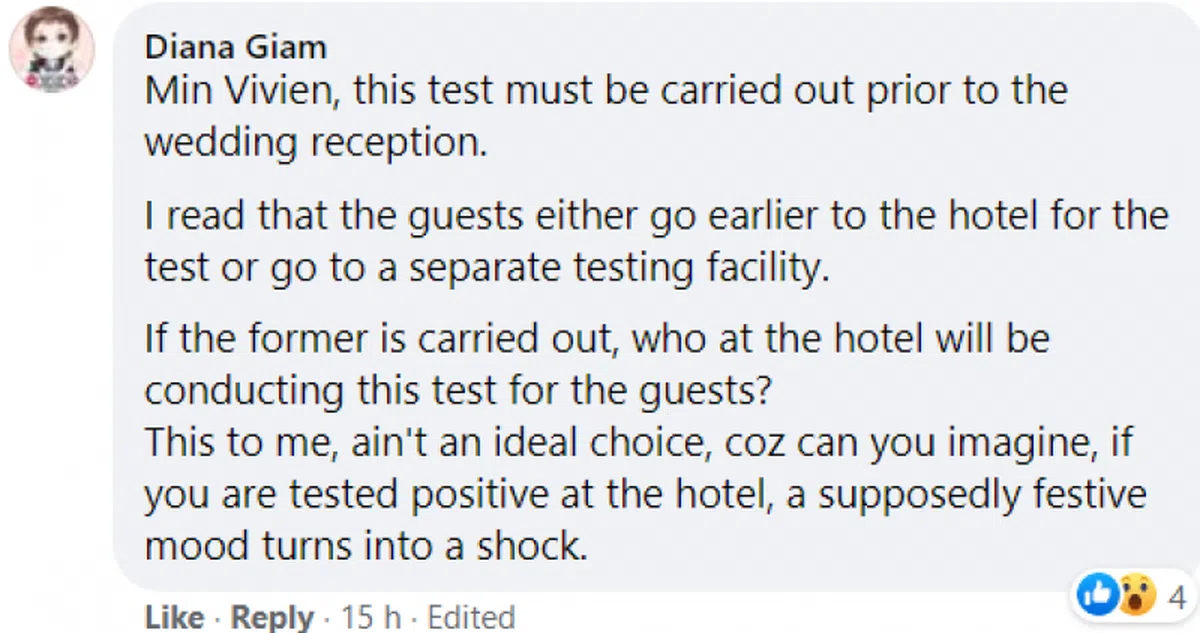 有网民指出,以婚礼为例,希望当局能允许提前到检测设施接受检测,而不是在婚礼当天才在婚宴现场外进行检测。否则,一旦检测结果呈阳性,原本喜悦的心情将被大泼冷水,婚礼直接从惊喜变成惊吓。