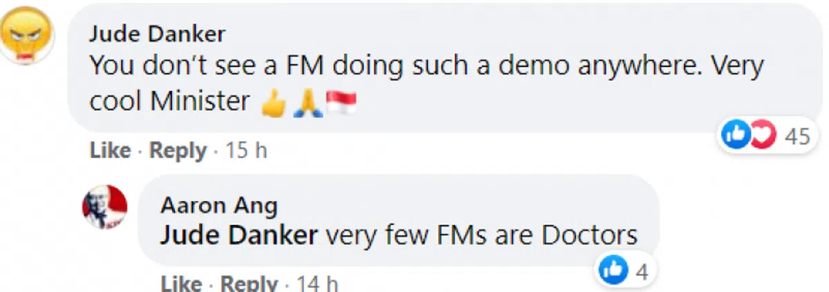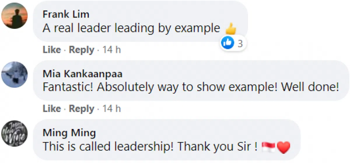 不少网民在贴文下留言说,这个视频让他们为新加坡深感自豪,纷纷为外长的以身作则点赞。