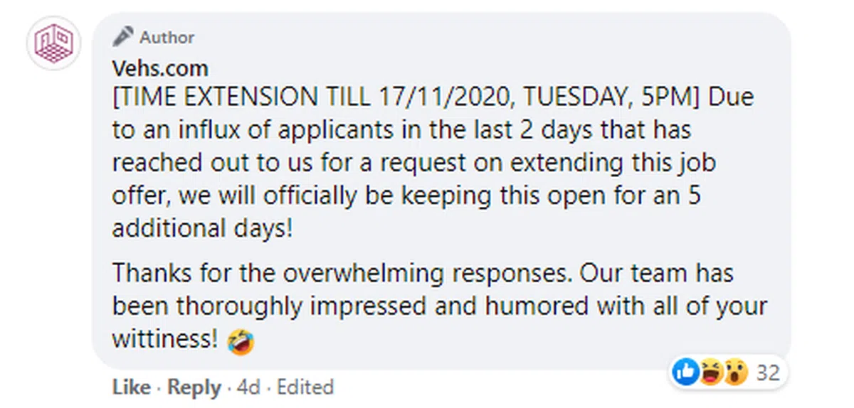 申请这份工作感觉也不是特别费时费力,更不需要发简历,只要在该广告贴文的评论区内发挥你的创意,用少于30个字来告诉VEHS公司,凭什么一定“非你莫选”?
