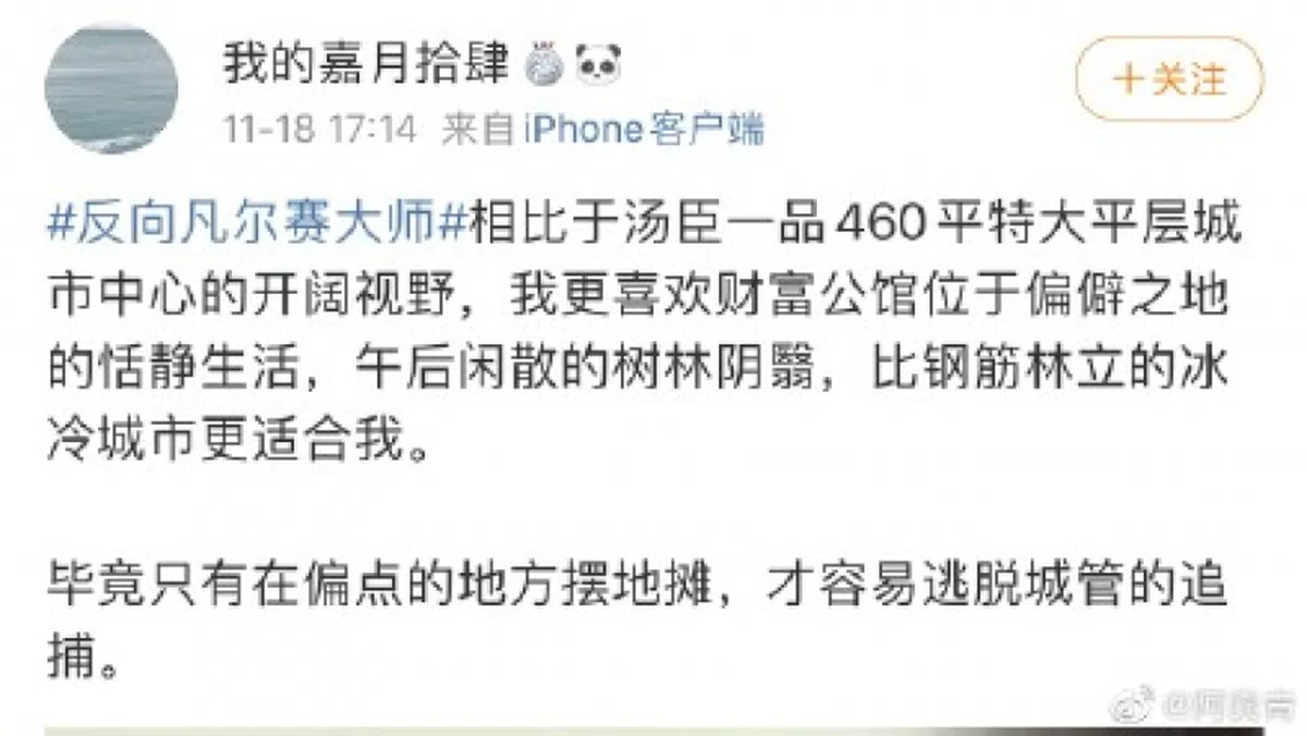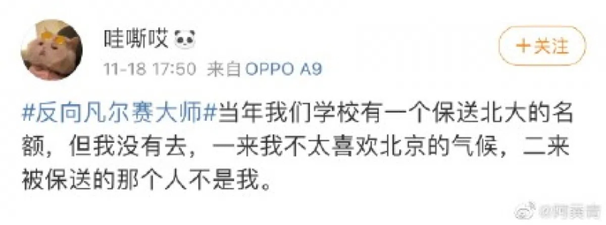 而就在昨天(18日)中国社交媒体微博热搜上又有了“反向凡尔赛大师”,顾名思义,就是比凡尔赛文学更山路十八弯,结尾要再反转一番: