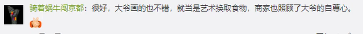 但也有网友为大爷用手绘“钱币”消费的行为缓颊,认为大爷只是用一技之长挣一口饭吃,透过艺术来“以物换物”换取自己的日常所需。