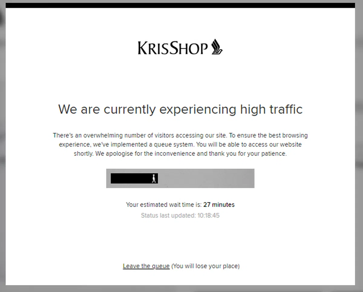 新航周边Kris Shop官网表示目前浏览的人过多,请“看官”开始排队……目前等待时间为27分钟,如果打算关掉网页,回来要重新排队。