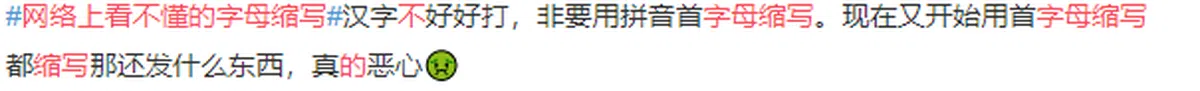 这些缩写多取用拼音的首字母,如果不是微博等社交媒体的资深用户,这套新的语言体系根本看不懂。
