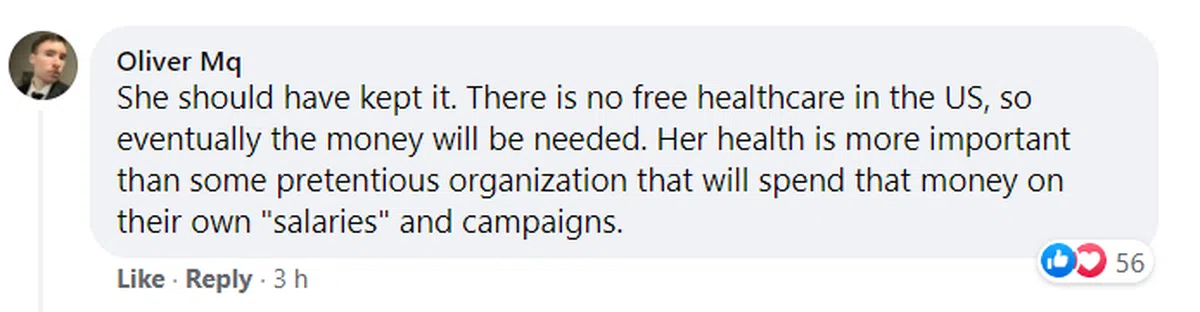 有网友认为,谢奶奶应该把这笔钱自己留下,毕竟美国没有免费的医疗体制,所以无论如何她还是会用到这笔钱的。谢奶奶的命,比起某些惺惺作态的组织,更为重要。