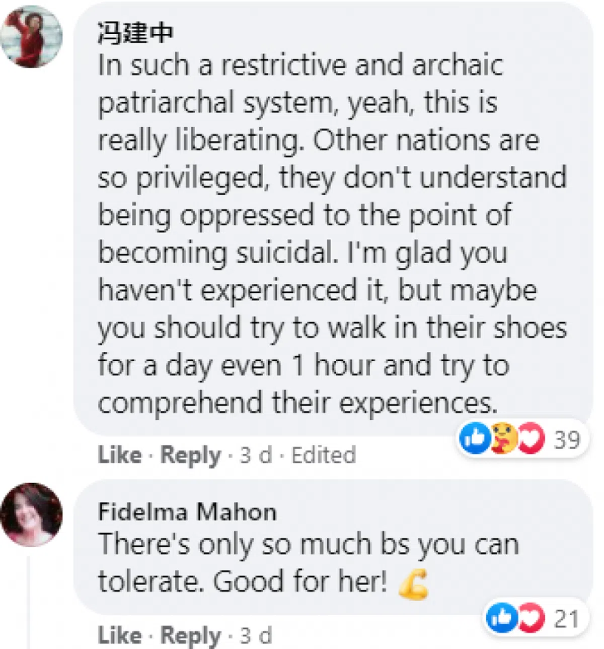 文章底下的诸多留言都对苏敏表达了敬意,为她的坚强和勇气喝彩。当然也不乏有指责她“抛夫弃女”的网民,但这些人几乎都被其他网民群起围攻骂回去。