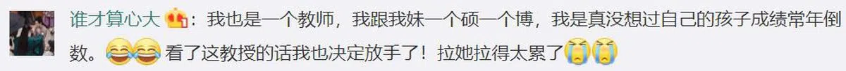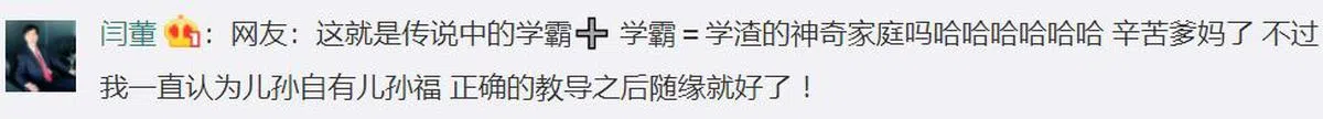 不少网民也直抒己见,认为教育不能一蹴而就,也不能强逼儿女一定要名列前茅。也有人深感欣慰,原来堂堂北大教授也有育儿烦恼。