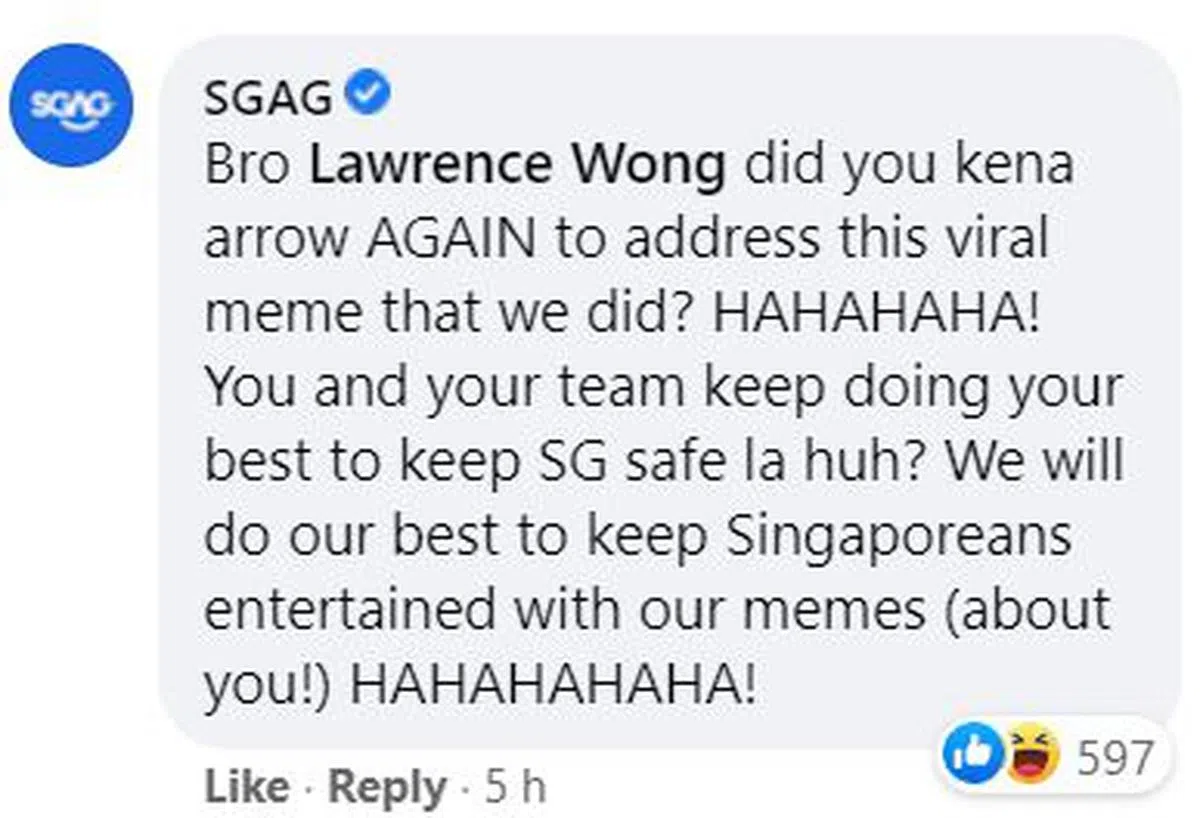 制作梗图的SGAG也不忘再抽一次水,调侃黄循财是否又kena arrow(中暗箭),被团队推出来回应这件事?