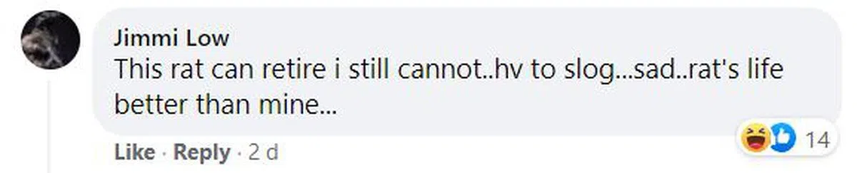 这位网民表示,老鼠都能安稳退休,而自己却还要努力搬砖打拼,看来老鼠的生活都比自己要来得好。