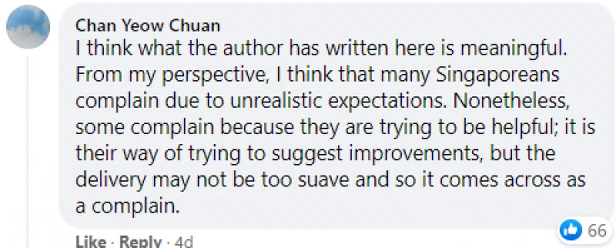 有网民指出,“很多新加坡人是因为期望不切实际而抱怨,但也有一些人是为了帮上忙才抱怨,这是他们提供建议的表达方式。由于做法粗糙,反倒让人听起来像在投诉。”