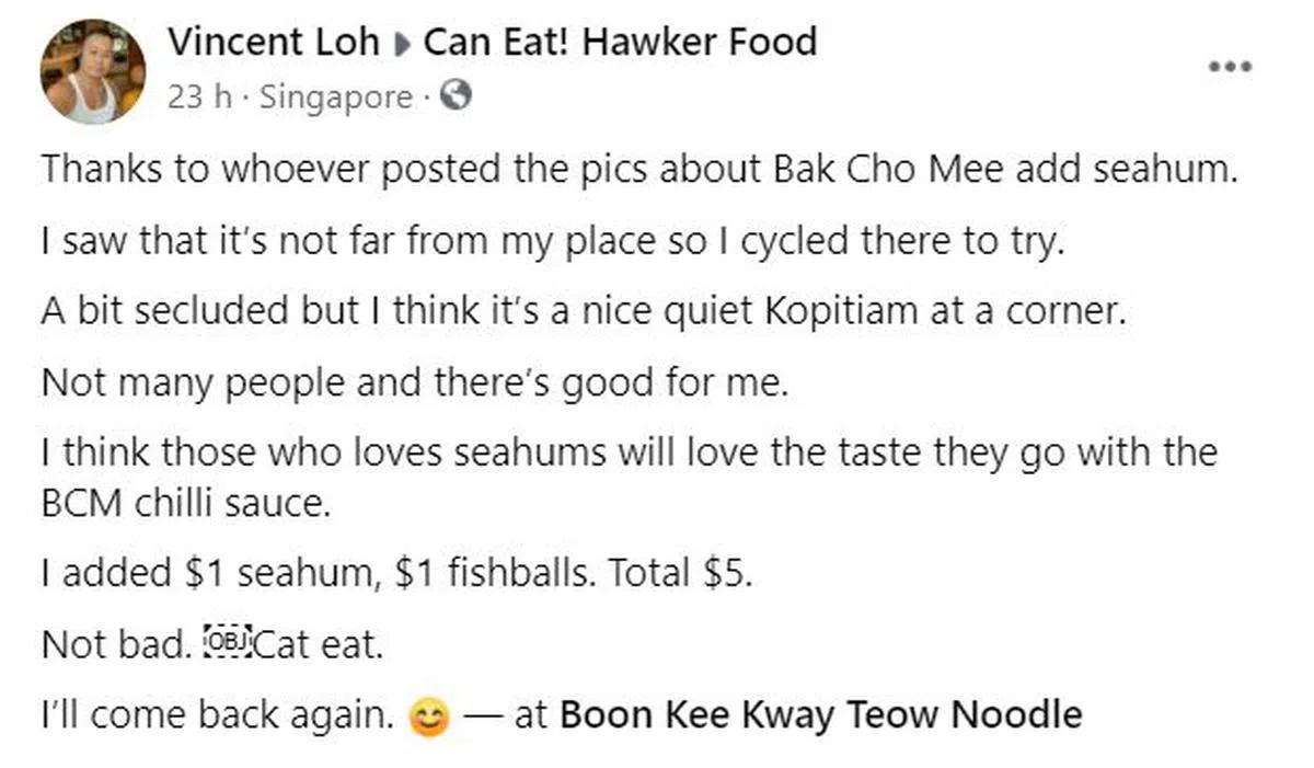 李显龙总理的“肉脞面——不管要不要加蚶(Bak Chor Mee, with or without Hum)”名言,这几天在本地掀起一阵“寻蚶记”。网民们都在四处找寻哪里有售卖总理所说的“加蚶肉脞面”。