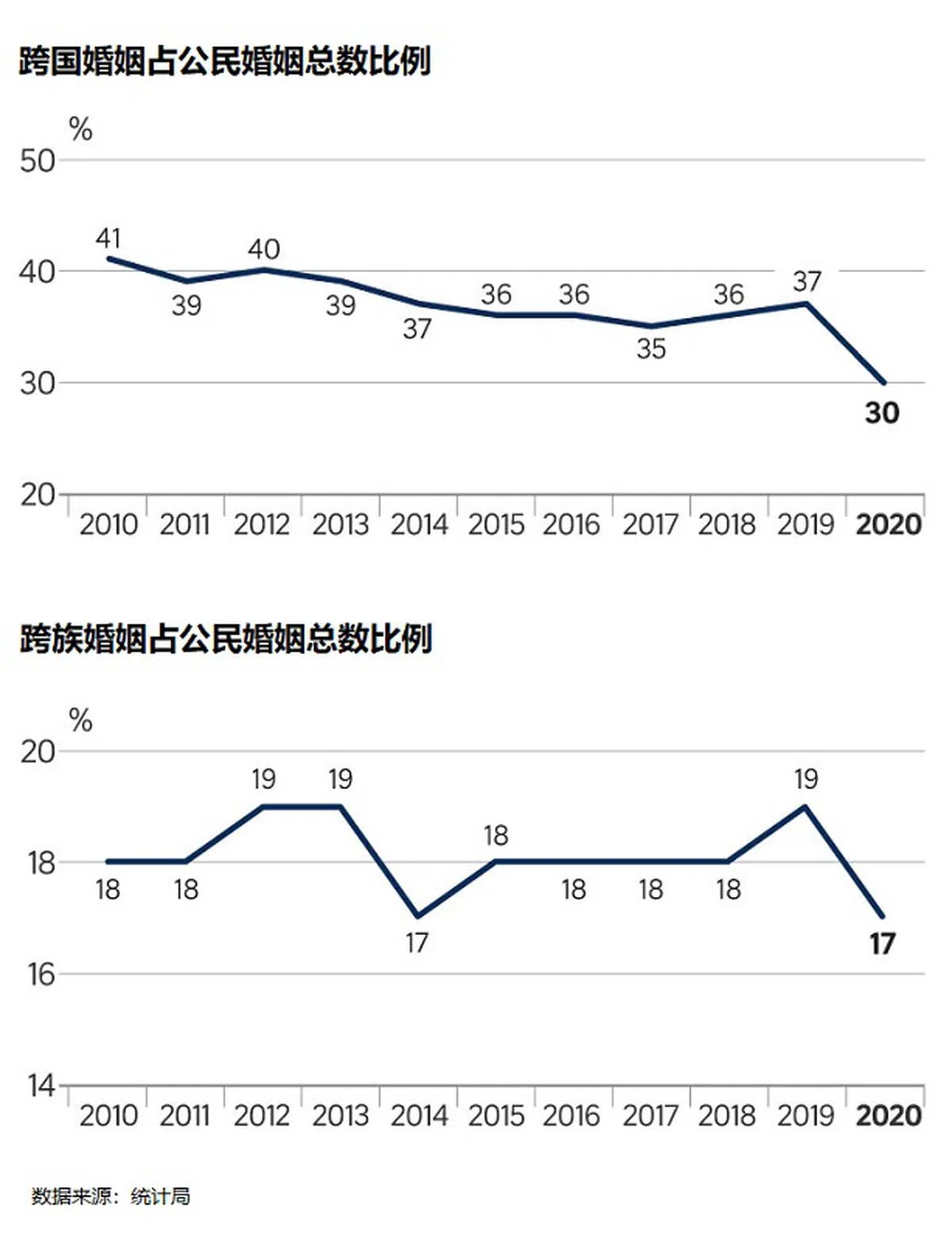 另外,去年异族通婚的比例也略有下降,占公民婚姻总数的17%,比前年的19%低。