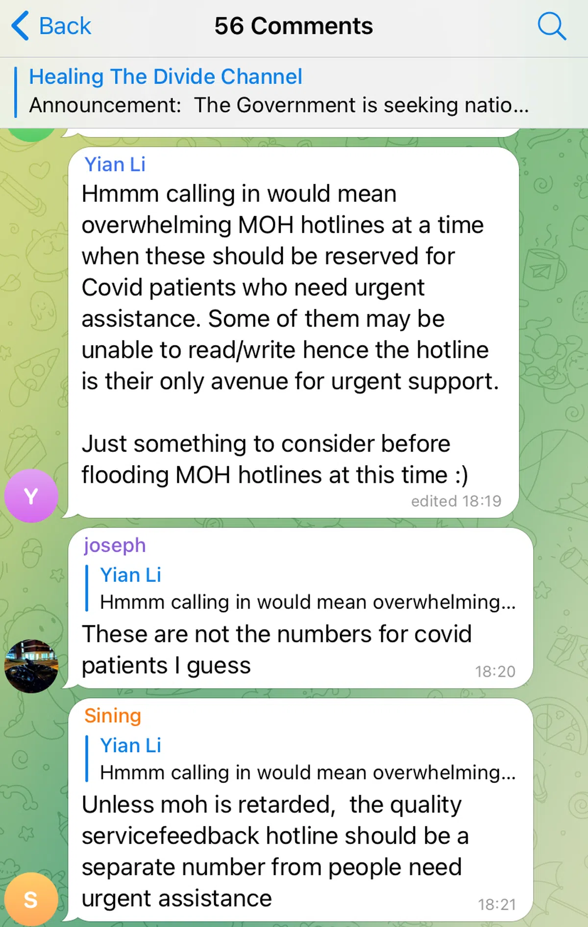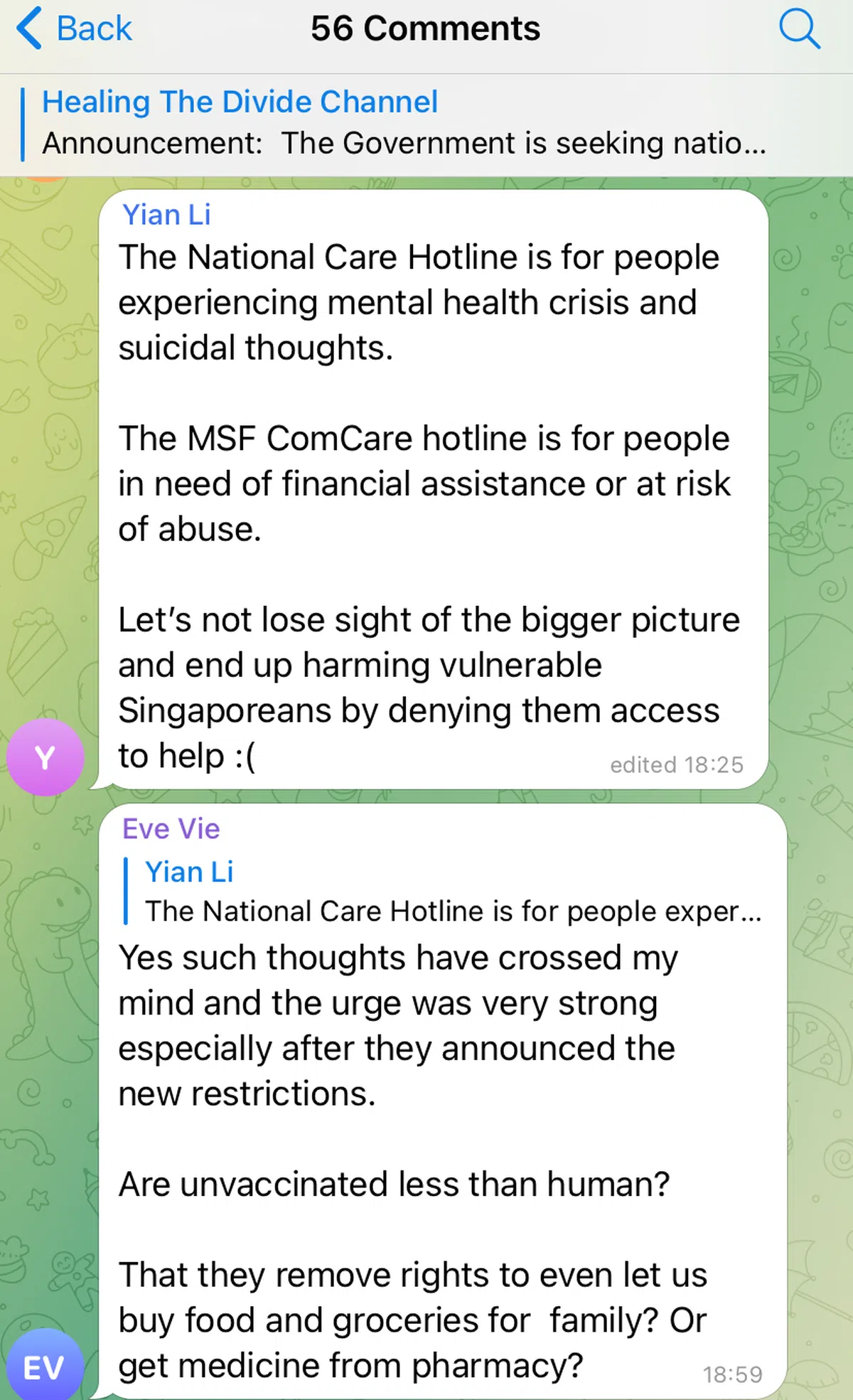 Reddit:反疫苗组织Healing The Divide称“政府正在收集反馈意见”,敦促成员大量拨打心理健康辅助全国关怀热线,以及其他社会及家庭发展部和卫生部热线