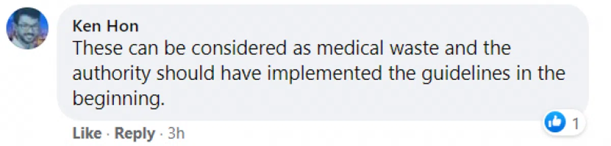 有网民认为使用过的口罩、手套这些防疫设备原本被视为医疗废物,各大医疗机构早有一套处理医疗垃圾的准则,当局应在鼓励大家援用这套准则,来正确处理这些医疗废物。