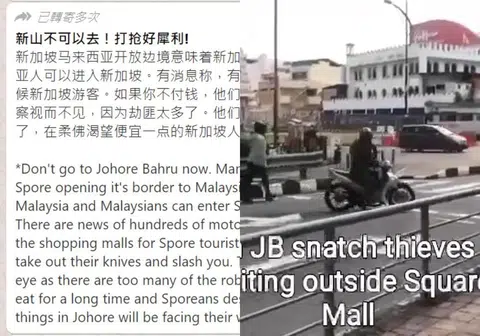 “新加坡马来西亚开放边境意味着新加坡人可以去马来西亚,马来西亚人可以进入新加坡。有消息称,有数百名摩托车劫匪在商场外等候新加坡游客。如果你不付钱,他们就会拿出刀子砍你。那里的警察视而不见,因为劫匪太多了。他们已经很长一段时间没吃东西了,在柔佛渴望便宜一点的新加坡人将面临最糟糕的恶梦!!”