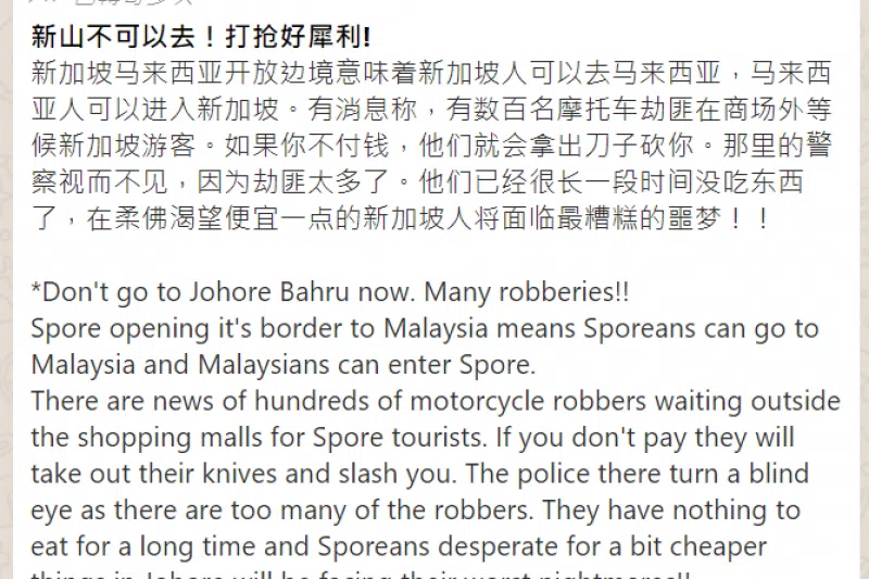 其中,在WhatsApp平台上就疯传一则中英双语的信息,声称新山数百名摩托车劫匪因为太长时间没东西吃,因此已集结在当地商场外等着抢劫新加坡游客,警告大家“新山不可以去!打枪好犀利(严重)!”。