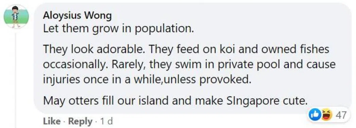 网民认为,水獭看起来很可爱,偶尔以锦鲤和其它鱼类为食。只有极少部分的时间会光顾私人泳池,或者伤人,而且通常都是因被人激怒所致。
