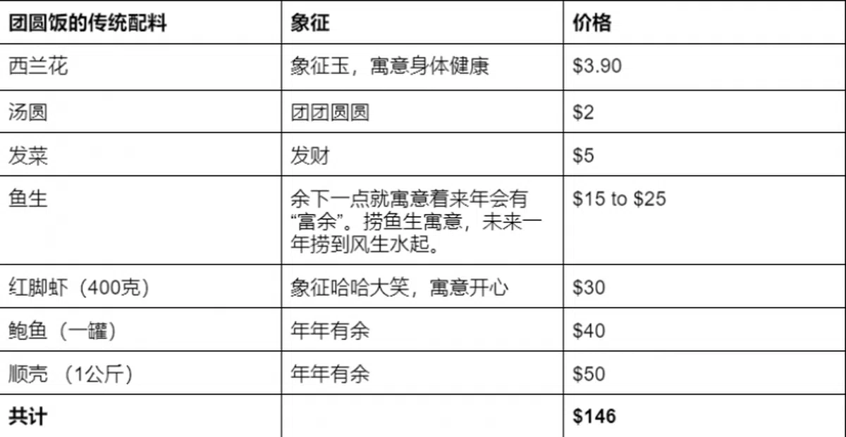 一些家庭的团圆饭菜单比以上这些还更丰盛,当然花费也会相对比较多一点。不过一年一次,最重要是吃得开心。