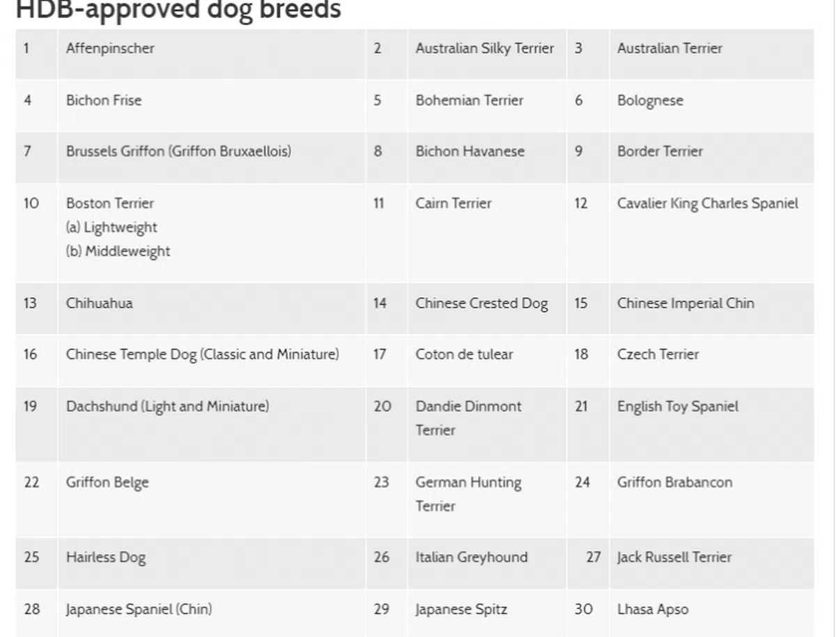 根据建屋发展局规定,组屋里饲养的狗儿体积不能太大,目前获批准饲养的犬类品种共有62个。违例者可被罚款高达4000新元。