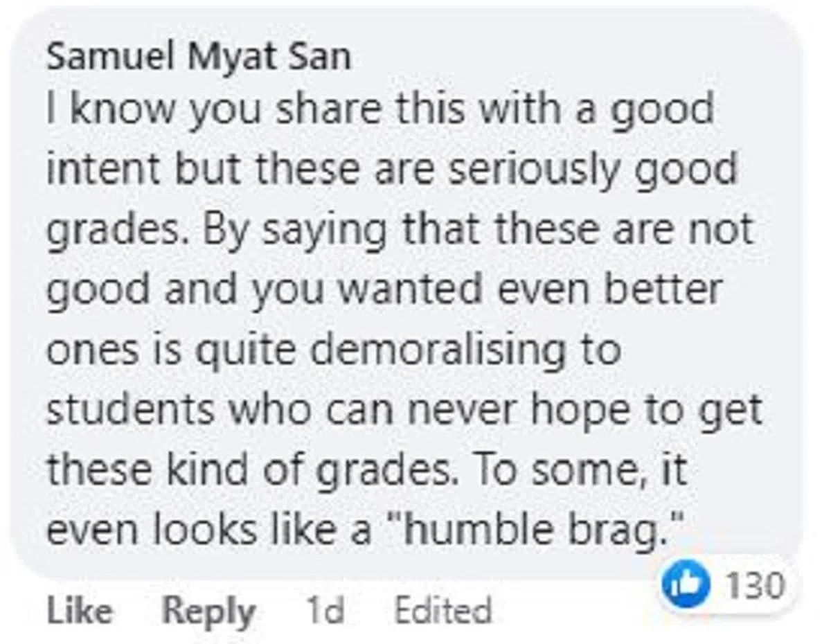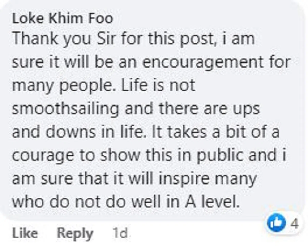 陈圣辉的贴文几乎一面倒获得网民给予正面评价。网民Loke认为此贴文确实能鼓励到很多人。毕竟要公开晒出这样的成绩单“需要一点勇气”,必能启发那些在A水准会考中考不好的学生。