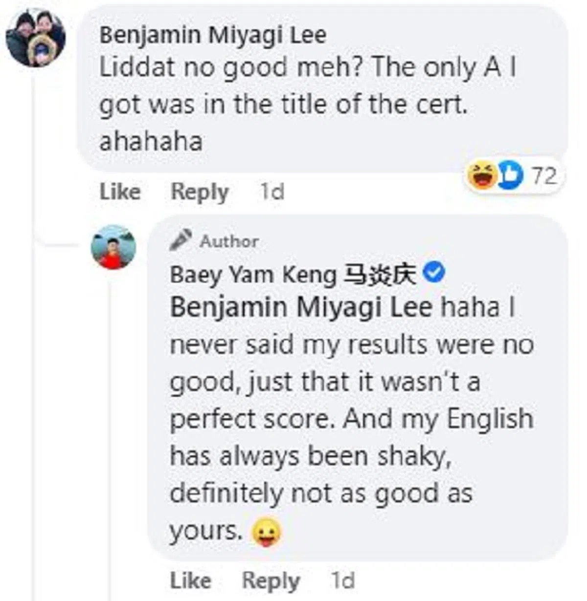 马炎庆竟然回复了Benjamin说,他并没有觉得自己的成绩不好,只是感叹并非全科优等的“完美考分”。